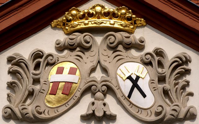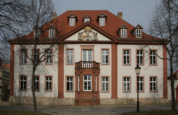 Dieses Domherrenhaus ist nördlich des Naumburger Domes zu finden (Domplatz 6). Im Dreiecksgiebel ist unter einer Krone ein Allianzwappen dargestellt. Die heraldisch rechte Schildkartusche zeigt das Wappen der thüringisch-sächsischen Vitzthum von Eckstädt. Es zeigt in Gold zwei rote Pfähle, überdeckt von einem silbernen Balken. Der Eindruck dieser Darstellung täuscht, denn die roten Pfähle sind im Wappen korrekterweise durchgehend und nicht abgeledigt wie in dieser Adaption für die Rocaille-Kartusche. Die hier nicht dargestellte Helmzier wäre ein roter oder silbern-rot gespaltener Spitzhut mit einem goldenen Stern an der Spitze, an jeder Seite mit drei Hahnenfedern je nach Quelle in der Farbe Grün oder in den Farben Rot-Silber-Gold oder alternierend rot-silbern besteckt, zu rot-goldenen, rot-silbernen oder rot-goldenen/rot-silbernen Decken. Das Wappen wird im Siebmacher Band: Bay Seite: 24b Tafel: 19, Band: Pr Seite: 428 Tafel: 471, Band: Bö Seite: 266 Tafel: 123, Band: BraA Seite: 99 Tafel: 60, Band: Sa Seite: 51 Tafel: 59 und Band: Sa Seite: 6 Tafel: 5 beschrieben. 1711 erlangte die Familie den Grafenstand, entsprechend gibt es noch ein vermehrtes Wappen.