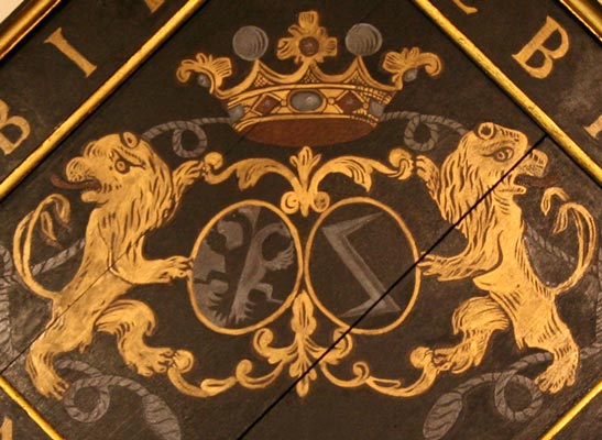 Die dritte Tafel trägt eine Inschrift, die offensichtlich einmal übermalt wurde unter Veränderung des Datums, aus dem 19. wurde der 16., und aus 1749 wurde 1748. Im Zentrum ist das prächtigste Wappen der drei Schilde, ein Allianzwappen aus zwei unter einer reichverzierten, neunperligen Rangkrone zusammengestellten Ovalkartuschen, als Schildhalter zwei doppelschwänzige, widersehende, goldene Löwen wie in den beiden anderen Tafeln auch. Um das Wappen herum befinden sich verschlungene und verknotete Schnüre, sog. Liebesseile, die bisweilen auf Frauenwappen und Ehewappen auftreten. Zwischen den beiden Ovalkartuschen erkennt man weitere Spuren der Alternativbemalung wie die Bügel eines Helmes, die in das Metzenhausen-Feld hineinreichen und den Rahmen kreuzen.
