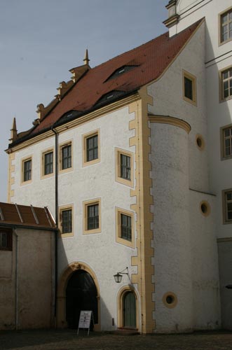 Dieses Allianzwappen am zweiten Torhaus zeugt von einer Ausbauphase im späten 16. Jh. unter Kurfürst August v. Sachsen (13.7.1526 - 12.2.1586), der 1553 - 1586 als zweiter Kurfürst albertinischer Linie regierte, und seiner Frau Anna von Dänemark (1532 - 1.10.1585). Nicht nur waren mittlerweile viele Gebäude baufällig geworden, sondern das Schloß wurde auch als Jagdschloß den Bedürfnissen der Zeit entsprechend modernisiert, ferner waren zusätzliche Bautrakte zur Verwaltung des Amtes notwendig geworden, die rund um den äußeren Hof erbaut wurden.