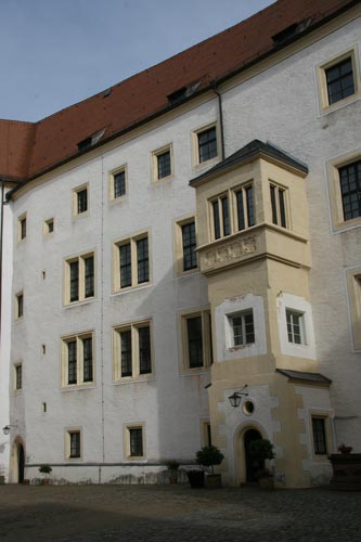 Die rechte Abb. zeigt den Erker des Fürstenhauses, welches den inneren Schloßhof im Osten begrenzt. Dieser Erker mit dem früher offenen Altan entstammt der spätgotischen Ausbauphase. Die übrigen Gebäude rings um den hinteren Schloßhof entstammen der Ausbauphase um 1519-1525 durch Baumeister Hans Zingkeyssen im Stile der frühen Renaissance.
