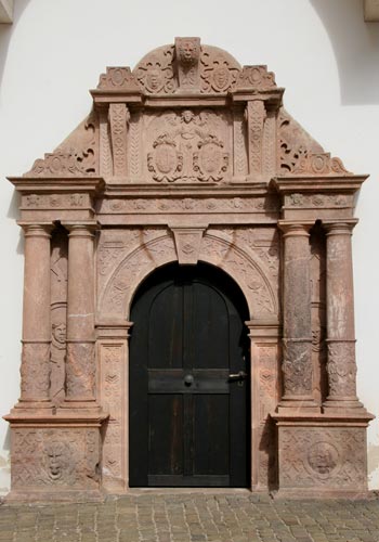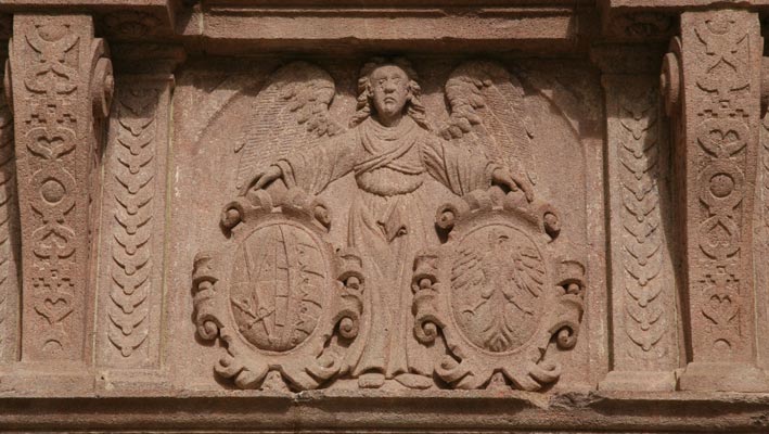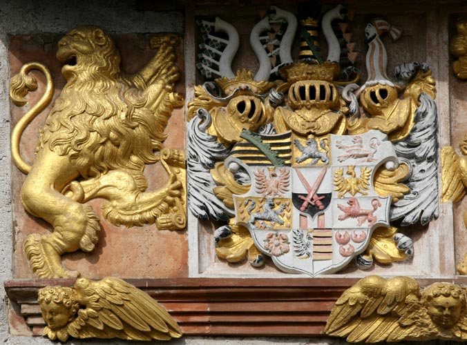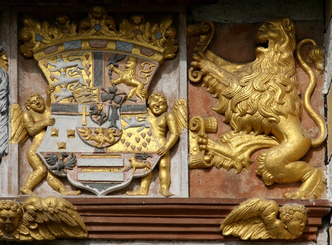 Interessant ist hier die ungleiche Behandlung der Wappen beider Ehepartner, die sich auch an anderen Objekten beobachten läßt: Während das Wappen des Ehemannes mit drei Helmen dargestellt wird, ist das Wappen der Frau aus königlichem Hause ohne Oberwappen; der Schild wird oben von einer edelsteinverzierten Krone bedeckt. Der Schild der Ehefrau hat zusätzlich zu den beiden Löwen, die die Gesamtkomposition außen flankieren, noch eigene Schildhalter in Form zweier geflügelter Gestalten. Drei geflügelte Engelsköpfe bereichern das Gesims unter den beiden Wappen.