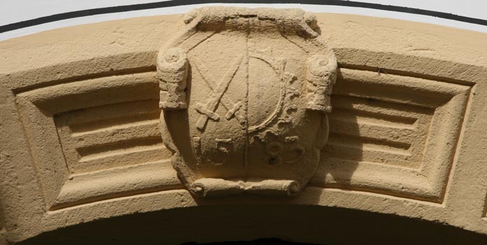 Abb.: Detail des äußeren Torbogens des zweiten Torhauses mit einem schnauzbärtigen Kopf in einem Medaillon zwischen Diamantbossen.