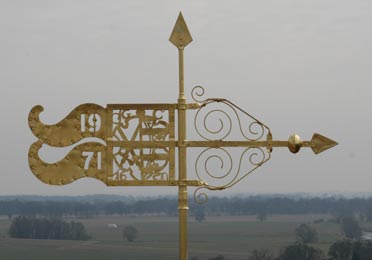 Abb. links: Blick über den Großen Bärengraben auf den Torflügel mit dem Turm am Zwinger. Abb. rechts: Wetterfahne mit dem kursächsischen Wappen.