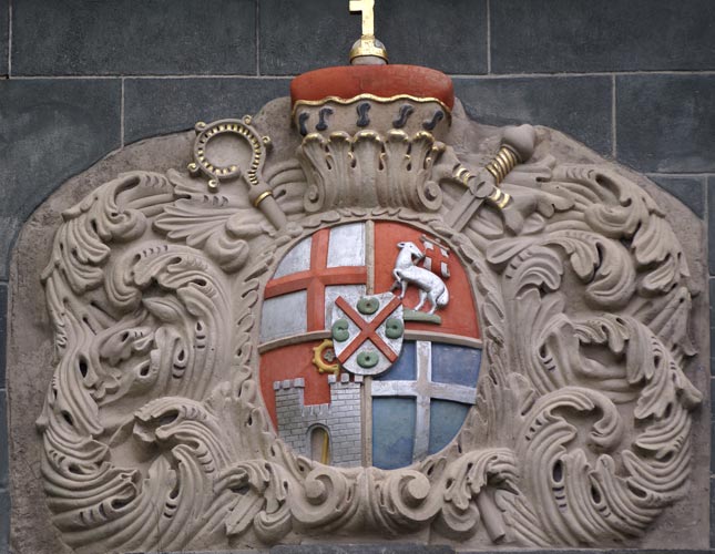Schwert und Krummstab, hinter der ovalen Kartusche schräggekreuzt, verweisen jeweils auf den Rang eines Fürstbischofs mit geistlicher und weltlicher Macht, in der Mitte dazwischen ein roter, hermelingestulpter Hut mit Reichsapfel mit goldenen Beschlägen und ebensolchem Kreuze, von dem hier ein Arm fehlt, für den Rang eines Kurfürsten.