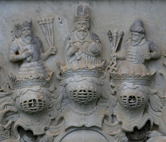 Der Trick an dieser Anordnung mit den beiden Beischilden ist, daß man so gut mit den fünf Helmen umgehen kann, ohne sie sehr in der Größe zu reduzieren, wie das bei einem Gesamtschild aus Platzgründen notwendig wäre. So kann man sogar die äußeren Helme des Hauptwappens nach außen verschieben, ohne daß es störend auffiele, im Gegenteil, alle fünf Helme bilden gemeinsam einen über die Gesamtkomposition gespannten Bogen. Man beachte in der Komposition auch die kleinen Details wie die zwischen Hauptwappen und Beiwappen entlang der ovalen Kartusche eingeschobenen menschlichen Figuren, rechts weiblich, links männlich, die den Schild des Beiwappens jeweils an einem Band halten und so für "Anbindung" sorgen. Durch die Komposition ergibt sich eine tiefere Position der beiden Beischilde; der Freiraum unter dem Hauptwappen wird mit einem geflügelten Engelskopf ausgefüllt.