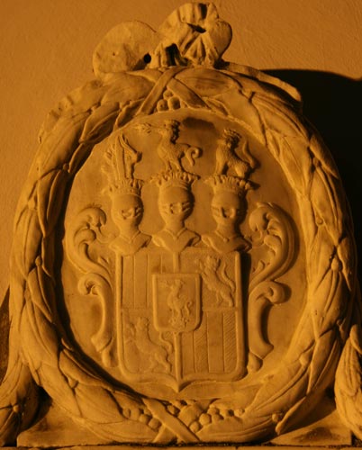 Bei Dunkelheit und angestrahlter Kirche kommen die Konturen besser hervor (zweite Aufnahme). Der Schild ist geviert: