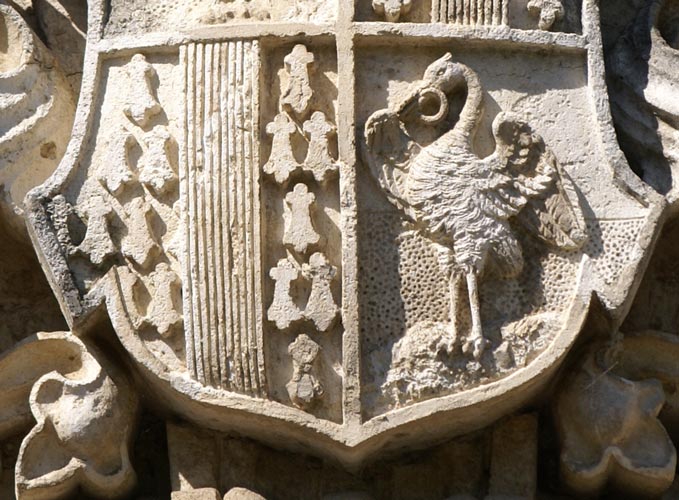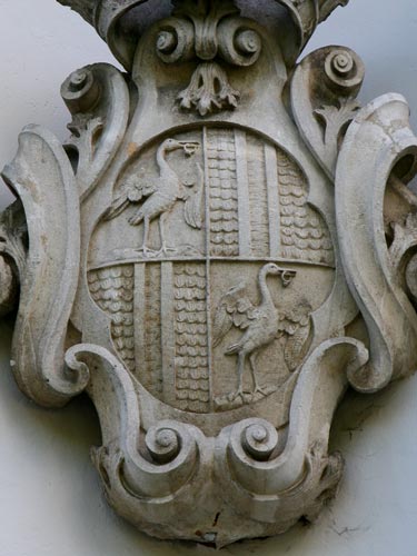 Es sei angemerkt, daß hier in Feld 2 und 3 eindeutig Hermelinschwänzchen zu sehen sind, wie insbesondere in der Detailaufnahme unten nachzuvollziehen ist, während auf der Nordseite des Schlosses und an der Kirche ebenso eindeutig schuppenförmiges Pelzwerk dargestellt wird. Im Bartsch ist schuppenförmiges silbernes Feh (Kürsch) abgebildet, im Siebmacher wird es in den meisten Fällen als Hermelin und nur in der Minderzahl als Kürsch abgebildet. Dieser Wechsel zwischen zwei unterschiedlich definierten Pelzwerkarten scheint mit einer gewissen uns heute unvorstellbaren Großzügigkeit gehandhabt worden zu sein, vermutlich, weil irgendwann keiner mehr so richtig wußte, welche Variante an Pelzwerk für die Herren von Planckenwerth korrekt war. Zu dieser Variationsbreite in den Quellen gesellt sich, daß der Storch auch als natürlich beschrieben wird bzw. auch mit roten Beinen und ebensolchem Schnabel, und daß ferner der Fingerring mit einem blauen oder türkisfarbenen Stein beschrieben wird.