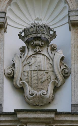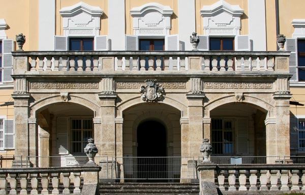 Am mittleren Bogen des gartenseitigen Altans des Südflügels befindet sich der Wappenschild der Grafen von Stürgkh: Er ist (Tinkturen nach der Abb. bei Bartsch) geviert, Feld 1 und 4: in schwarz-golden geteiltem Feld auf grünem Dreiberg ein auffliegender Storch in verwechselten Farben, im Schnabel einen goldenen Ring haltend (Stammwappen, hier in Feld 1 einwärts gewendet), Feld 2 und 3: hier in Hermelin (sonst Kürsch, Pelzwerk) ein roter Pfahl (Planckenwerth, Planckenwarth). Zum hier nicht dargestellten Oberwappen siehe im Detail die Ausführungen zur Pfarrkirche.