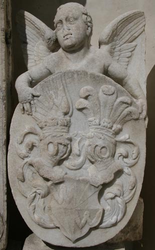 Zu beiden Seiten dieses Zentralfeldes sind zwei von Putten gehaltene Wappensteine lose aufgestellt, wobei die Positionen vertauscht sind. Das Wappen des Ehemannes Christoph ist das vermehrte Wappen der Welzer, geviert, Feld 1 und 4: in von Rot und Silber gespaltenem Feld ein aus den Seitenrändern hervorkommender, W-förmig niedergebogener Treuebund, der rechte Arm silbern geharnischt, der linke Arm rotgewandet (Stammwappen Welzer), Feld 2 und 3: In Schwarz eine gestürzte silberne Schräglinksspitze (schräglinke gestürzte Spitze), hier in Feld 3 einwärts gewendet, also schrägrechts gestürzt (Tennberg, am 28.10.1361 verlieh Erzbischof Rudolf von Salzburg der Familie von Welzer das heimgefallene Wappen der ausgestorbenen von Tennberg). Dazu werden zwei Helme geführt, Helm 1 (rechts): auf gekröntem Helm ein geschlossener Flug mit dem Treuebund wie im Schild, Decke rot-silbern (Stammkleinod Welzer), Helm 2 (links): auf gekröntem Helm fünf Straußenfedern, abwechselnd schwarz und silbern ("ein silberner poschen mit swartzen raitzeln"), Decken schwarz-silbern (Kleinod Tennberg). Die Entwicklung des Welzer-Wappens wird ausführlich im Kapitel zur Kirche von Wilhermsdorf behandelt. Im Siebmacher wird das Wappen Welzer im Band: NÖ2 Seite: 531 Tafel: 263-264 beschrieben.