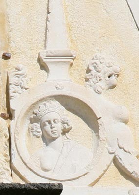 Details: Zu beiden Seiten des Portals befinden sich in den Seitenabschnitten der Konstruktion Nischen mit Figuren. Auf der linken Seite ist das der antike Kriegsgott Mars (gr. Ares) mit schlecht erhaltenen Waffen in den Händen und fein ziseliertem Brustharnisch und federgeschmücktem Helm, auf der gegenüberliegenden Seite die Kriegsgöttin Bellona (gr. Enyo) mit Schild und ebenfalls federgeschmücktem Helm sowie mit einem kleinen Schuppenpanzer vor dem Bauch (der hier eher wie ein Häkeltäschchen aussieht). Die ihr zugeschriebene verwandtschaftliche Beziehung zu Mars variiert, in der späteren römischen Mythologie ist sie entweder die Ehefrau, die Tochter oder die Schwester von Mars, alternativ seine Wagenlenkerin.