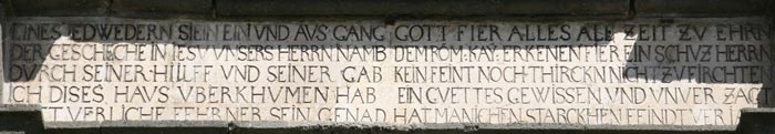 Rechter Teil der Inschrift: "WAS ICH IN 16 IAHR HIER HAB LASSEN PAVEN (ERBAUEN) DAS IST WOLL (WOHL) ZV SECHEN (SEHEN) VND ANZVSCHAVEN KAIN (KEIN) HALLER (HELLER) MICH NICHT REVEN (REUEN) THVET (TUT) ICH MAINS (MEINE ES) DEM VATTERLAND ZV GVETT (GUT) ANNO DOMINI 1653". Eine sehr selbstbewußte Aussage - was wäre der Schutz des Vaterlandes noch wert, wenn die Gallerin nicht mit eigenen Mitteln diese Burg zur starken Festung ausgebaut hätte!
