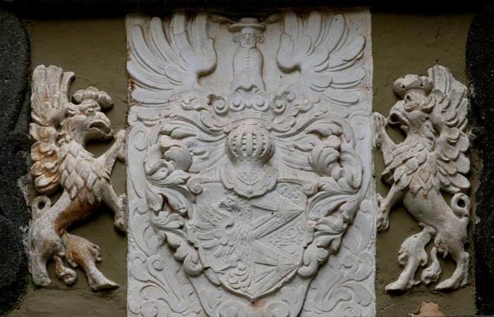 Dies ist das dritte Wechsler-Wappen auf dem Burgberg in gerader Abfolge. Es ist noch schlichter gehalten als die beiden vorherigen, was vor allem auch daran liegt, daß hier die Tür und die Portalrahmung wesentlich kleiner dimensioniert sind und Zugang zu den Wohn- und Repräsentationsräumen im Inneren geben. Hier begegnen uns zwei andere Schildhalter als an den beiden wesentlich repräsentativeren Wappen an den weiter außen gelegenen Toren, hier sind es nämlich Greifen mit Flügeln und gekröntem Adlerkopf mit nach oben lang ausgezogenen Ohren, Gefieder auf der Brust und mit Löwenunterleib und ebensolchen Hinterbeinen. Ein weiterer Unterschied zu den beiden äußeren Wechsler-Wappen ist, daß hier im privateren Bereich auf eine repräsentative Bauinschrift verzichtet wurde.
