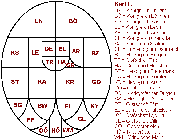 Der Schild ist gespalten und dreimal geteilt, mit eingepfropfter Spitze und mit geviertem, erhöht positioniertem Herzschild. Dadurch ergeben sich im Hauptschild 9 Hauptfelder, die fast alle noch einmal unterteilt sind, und im Herzschild vier Felder. Die ersten beiden Reihen enthalten die Königreiche der Habsburger; der Herzschild und die restlichen Reihen die Herzogtümer und Grafschaften der habsburgischen Kronländer. Die Diskussion der Inhalte erfolgt reihenweise: