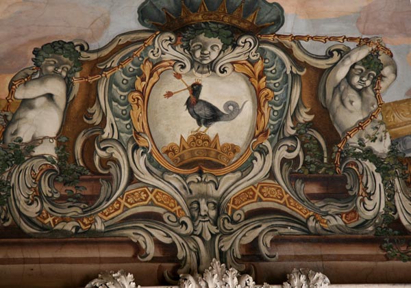 Weit besser erkennbare, da farbige Wappen befinden sich in dem offen zugänglichen, weitläufigen Haupttreppenhaus als Malerei auf dem Plafond, beide in Kartuschen mit Groteskenmasken unten, Puttenkopf oben und zwei begleitenden Putten seitlich, die mit den goldenen Girlanden spielen. Wir haben das Glück, daß das Palais Attems nach wie vor hinsichtlich aller Wand- und Deckendekorationen noch original ausgestattet ist, nur die bewegliche Einrichtung ist verlorengegangen. Und es konnte seine ursprüngliche Innenraumstruktur bewahren. Das macht die kunsthistorische Bedeutung dieses Palais aus, vor allem, weil es in einem Zug erbaut wurde und später so gut wie nicht verändert wurde.