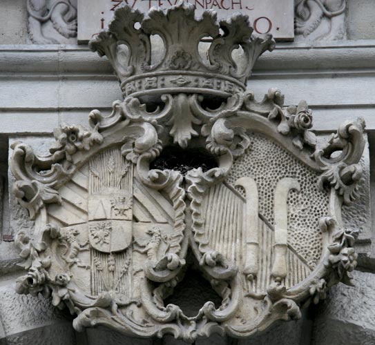 Carl Graf von Saurau ließ nach dem Kauf des Anwesens die Fassade weitgehend unverändert, so daß die beiden Obergeschosse noch die steinernen Fensterrahmen mit Profilbänken und geraden Verdachungen von 1566 haben, als die v. Windischgrätz das Palais erbaut hatten. Von ihm stammt aber das Renaissanceportal mit einer auf ihn und seine Frau zutreffenden Personalisierung. In den beiden Bogenzwickeln des Portales finden wir die der Bauzeit zuzuordnenden Wappendarstellungen, zu denen auch die Inschrift über dem Portalscheitel paßt. Beide Wappen sind in starker Schräglage in die Bogenzwickel zwischen die grobschlächtigen Rustikaquader eingequetscht, so daß man sie erst beim zweiten Hinsehen bemerkt. Im Gegensatz zu dem zuvor beschriebenen Allianzwappen handelt es sich hier jedoch um Vollwappen. Das auf der optisch linken, heraldisch rechten Seite gehört zu Carl Graf v. Saurau (-15.6.1648), Sohn von Wolfgang Freiherr v. Saurau-Ligist und Elisabeth v. Gera, der Landeshauptmann der Steiermark war, der 1628 Graf wurde und der mit Susanna Catharina Freiin von Teuffenbach vermählt war.