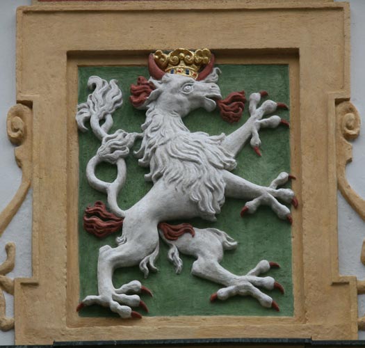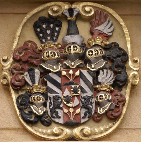 Der Literaturspiegel ist sehr uneinheitlich und unbefriedigend, was diese Familie betrifft. Das Stammwappen, wie bei Z. Bartsch abgebildet, sind die Geißeln alleine. Im Rietstap/Rolland erscheinen ebenfalls nur die beiden Geißeln, im Rolland in der Mitte mit einem goldenen Ring fixiert. Das erste vermehrte Wappen entstand unter Hinzunahme des von Kürsch und Rot geteilten Feldes (Gräßl, Graßl, vgl. Kraßler S. 13, S. 23), im gevierten Wappen in den Feldern 2 und 3, während die Geißeln in den Feldern 1 und 4 positioniert wurden (Kraßler S. 13). Das um den farbverwechselten Liliendreipaß in den Feldern 2 und 3 bereicherte vermehrte Wappen mit dem von Kürsch und Rot geteilten Herzschild, wie wir ihn hier sehen, beschreibt Kraßler auf A. 194. Diese Form erscheint nicht im Siebmacherschen Wappenwerk (Band: NÖ1 Seite: 87 Tafel: 43, Band: PrGfE Seite: 27 Tafel: 18). Dafür erscheint dort ein anderes vermehrtes Wappen, geviert mit Herzschild, Feld 1: in Schwarz ein goldener Pfahl, Feld 2: in Rot ein silberner Schrägbalken, oben mit drei schräglinks gestellten silbernen Kleeblättern besteckt, Feld 3: in Gold einwärts ein schwarzer, gekrönter, doppelschwänziger Löwe, Feld 4: in Rot ein goldenes Objekt, das einmal als "entwurzelte Blätterstaude" und einmal als ein "mit Früchten behangener Granatapfelbaum" bezeichnet wird (sic), Herzschild rot mit den beiden schräggekreuzten goldenen Geißeln. Eine Variante mit diesen Elementen des Hauptschildes, aber mit einem von Kürsch und Rot geteilten Herzschild findet sich bei Kraßler auf S. 23 beschrieben, wobei allerdings neben farblichen Abweichungen für Feld 1 das Objekt in Feld 4 als "Fischgräte" angesprochen wird, nun die dritte Bezeichnung. Was es nun wirklich war, läßt sich wohl kaum noch ergründen. Viel häufiger wird bei Kraßler die den Angaben im Siebmacher entsprechende Variante des Wappens beschrieben, die im Herzschild die schräggekreuzten "Fackeln" hat, in den übrigen Feldern die Elemente wie zuvor beschrieben (Pfahl, Schrägbalken mit Blättern, Löwe, "Fischgräte"), so auf. S. 23, S. 126, S. 189 und S. 253. Zu dem beschriebenen vermehrten Wappen werden im Siebmacher (Band: NÖ1 Seite: 87 Tafel: 43, Band: PrGfE Seite: 27 Tafel: 18) drei gekrönte Helme beschrieben: Helm 1 (Mitte): auf dem Helm mit rot-goldenen Decken ein roter Flügel, belegt mit den zwei schräggekreuzten goldenen Geißeln (wie auch hier am Gebäude), Helm 2 (rechts): auf dem Helm mit schwarz-goldenen Decken zwei Büffelhörner, rechts golden, links schwarz, beiderseits mit je drei Kleeblättern von verwechselter Farbe besteckt (hier am Gebäude wenigstens ähnlich), Helm 3 (links): auf dem Helm mit rot-silbernen Decken ein Busch von fünf schwarzen Straußenfedern, belegt mit einem silbern-rot geteilten Schildchen (hier am Gebäude der Turnierhut zusätzlich, und natürlich Kürsch statt Silber, denn es handelt sich um eine Wiederholung des Herzschildes). Soweit der Literaturspiegel mit wenig einheitlichem Bild.