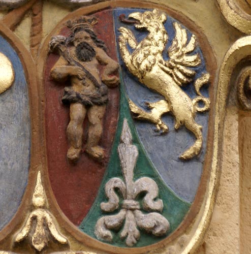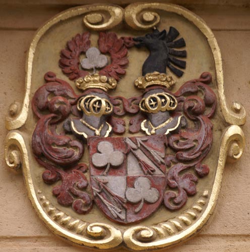 Zu diesem Wappen gehören zwei gekrönte Helme: Helm 1 (rechts): auf dem Helm mit rot-silbernen (hier ganz rot gestrichenen) Decken ein silbernes, dreiblättriges, gestieltes Kleeblatt aufrecht zwischen einem offenen roten Adlerflug, Helm 2 (links): auf dem Helm mit rot-silbernen (hier ganz rot gestrichenen) Decken ein wachsender schwarzer, rot feuerspeiender Pantherrumpf, am Rücken mit Federn besteckt.