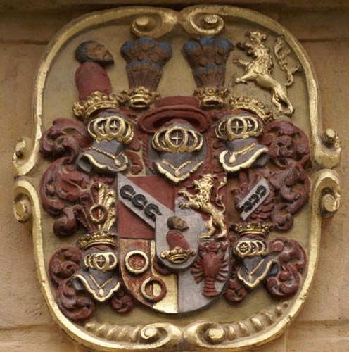 Die Inschrift des mittleren Wappens am Grazer Zeughaus nennt "WILHALM FRYHERR VON RATTMANNSTORFF", Wilhelm Freiherr von Rattmansdorf (Rattmannsdorff, Rattmanstorff, Rattmannstorff, Radmannsdorf, Ratmannstorf, Ratmannsdorf, et al.). Exakt wie hier findet sich der Schild bei Z. Bartsch abgebildet. Der Schild ist geviert mit Herzschild, Feld 1: in Rot ein silberner, mit drei nach der Figur gelegten, schwarzen Hufeisen belegter Schrägbalken (Stammwappen), Feld 2: in Rot ein einen silbernen Felsen erklimmender, goldener, golden gekrönter Löwe, Feld 3: in rot-golden gespaltenem Feld drei (2:1) Ringe in verwechselten Farben, Feld 4: in Silber ein aufrecht gestellter roter Krebs, Herzschild: in Silber aus einer goldenen Krone wachsend ein abgewendeter, rot gekleideter, bärtiger Mannesrumpf (Greisenrumpf, hier ist das Stammkleinod im vermehrten Wappen nach unten gewandert). Lediglich einen Unterschied gibt es bei der Darstellung des Schildes bei Z. Bartsch: Die Tinkturen von Feld 3 sind vertauscht. Im Siebmacher wird das Wappen in Band: OÖ Seite: 290 Tafel: 77 beschrieben, mit dem selben Unterschied bzgl. Feld 3.
