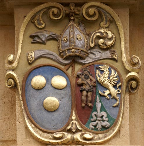 Der letzte Schild ganz links ist ein geistliches Wappen. Zwei ovale Schilde sind unter den Symbolen eines infulierten geistlichen Würdenträgers zusammengestellt, mittig eine silberne, golden verzierte Inful mit zwei seitlich abflatternden silbernen Bändern mit goldenem Fransenabschluß, pfahlweise ein Vortragekreuz, schräglinks gestellt ein Stab eines Klostervorstehers. Die Inschrift nennt "ANDREAS PROBST ZU ROTTENMANN", Andreas Pechinger Propst des Augustiner-Chorherrenstiftes Rottenmann.