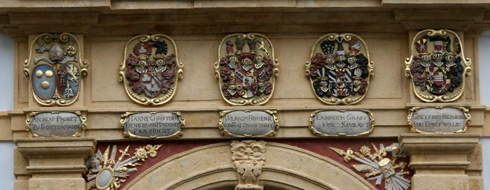 Die Inschrift des zweiten Wappens von links nennt "HANNS CHRISTOPH FREYHERR VON MYNDORFF PRAESIDENT", Hans Christoph Freiherr von Mindorf. Dieser war landschaftlicher Einnehmer, steirischer Landesoberst, "Obrister des Aufgebotes zu Roß und zu Fuß" und Kriegszahlmeister. Er starb am 21.12.1648 und beschloß damit seine Familie im Mannesstamm.