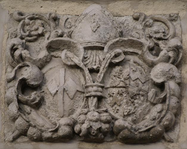 Dieses Doppelwappen ist Urban Weber, Abt des Benediktinerstifts Admont, zuzuordnen. Er amtierte 16281659 als 47. Abt. Er gilt als Erneuerer des Klosters, ferner war er der Erbauer des Schlosses Röthelstein. Der heraldisch rechte Ovalschild zeigt das Stiftswappen von Admont, von Silber und Rot gespalten mit zwei anstoßenden, facettierten Rauten in verwechselten Farben. Der andere Ovalschild enthält das persönliche Wappen des Abtes, geviert, Feld 1 und 4: eine mit der Traube hier schrägrechts nach oben gestellte, gestielte Weintraube mit zwei Weinblättern, Feld 2 und 3: ein Doppelsturzsparren zwischen drei (2:1) Sternen (Hinweise zu Tinkturen willkommen).