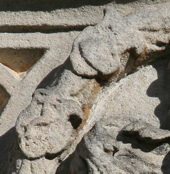 Außenansicht des äußeren Tores mit dem besprochenen Wappenstein in situ. Rechts eine der Kugelscharten mit beweglichem Steinauge, die maximale Flexibilität der Schußrichtung bei minimalem Risiko für den Schützen kombinieren, allerdings bei kaum vorhandener Sicht. Solche Kugelscharten finden sich zwar auch an anderen Burgen, doch dort sind die Augen meistens aus Holz.