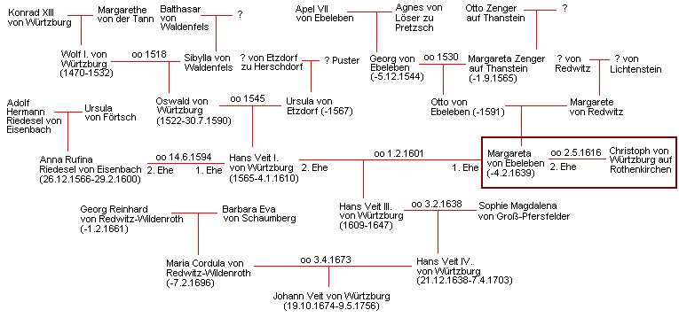 Auf der Seite der Margareta von Ebeleben (-4.2.1639) sind die vier Großeltern Georg von Ebeleben (-5.12.1544) mit dem silbern-rot geteilten Schild und dessen 1530 geehelichte Frau Margareta Zenger auf Thanstein (-1.9.1565) mit dem charakteristischen, redenden Zangenwappen (von Schwarz und Gold geteilt, oben eine querliegende silberne Zange), weiterhin ein Großvater aus der Familie der von Redwitz (siebenmal blau-silbern geteilt und belegt mit einem roten, schrägrechten Wellenbalken) und dessen Frau aus der Familie der von Lichtenstein (von Rot und Silber im Zackenschnitt quadriert).
