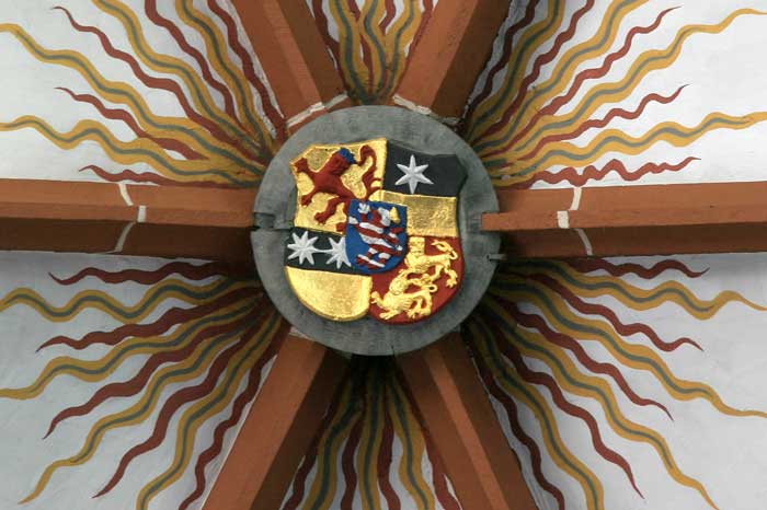 Im gotischen Netzrippengewölbe der Stadtkirche Darmstadt befindet sich neben einem mit einem Baumeisterzeichen verzierten Schlußstein ein weiterer Schlußstein mit dem Wappen der Landgrafen von Hessen, das dem ab 1479 geführten Aufbau entspricht: