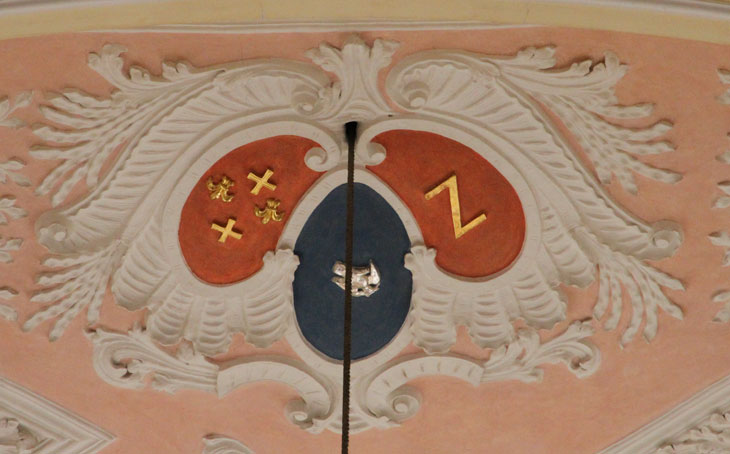 An der Decke ist diese Dreier-Kombination zu sehen, die Taube des Oberzeller Abtes Sigismund Hauck, flankiert von den beiden heraldischen Elementen des Klosters Oberzell. Dieser Abt wurde 1669 in Neustadt an der Saale geboren, am 7.4.1710 zum Abt gewählt und starb am 18.8.1738. Das Wappen ist auch an Stuckdecken in Oberzell zu sehen, dort jedoch golden auf einer Hügellandschaft stehend, weiterhin ist ein entsprechendes Exlibris dieses Abtes bekannt.