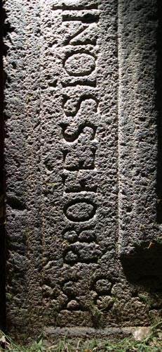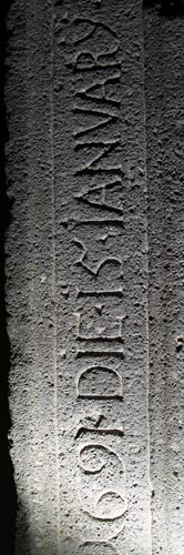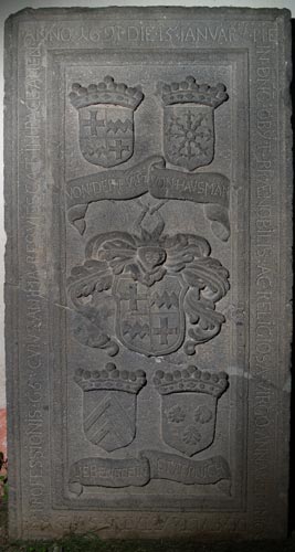 Die umlaufende Inschrift lautet: "ANNO 1691 DIE 15 JANVARY DIE IN D(OMI)NO OBYT (=OBIIT) PRAENOBILIS AC RELIGIOSA VIRGO ANNA VERONICA DE FÜLTZ AETATIS SVAE 83 PROFESSIONIS 65 CVIVS ANIMA REQVIESCAT IN PACE AMEN". Im Jahre 1691 am 15. Januartag ging von uns die edle und gottesfürchtige Jungfrau Anna Veronica von der Feltz in ihrem 83. Lebensjahr und in ihrem 65. Berufsjahr, deren Seele in Frieden ruhe, Amen.