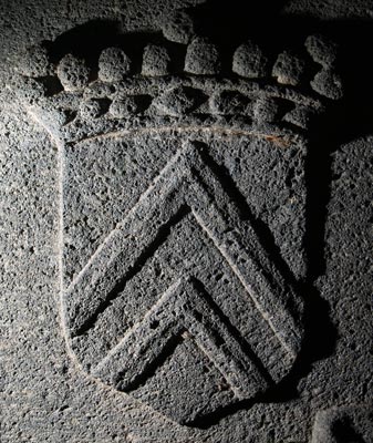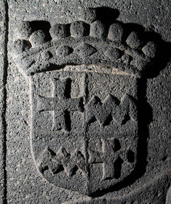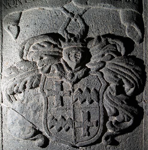 Hier wird der Name zweimal "de Fültz" geschrieben. Diese luxemburgisch-moselländische Familie ist besser bekannt als von der Feltz oder auch unter dem französischen Namen Larochette. Beim Vollwappen in der Mitte der Platte ist auch die Helmzier mit dargestellt, wohingegen die Ahnenprobe nur die vier, jeweils mit einer Krone bedeckten Schilde ihrer vier Großeltern zeigt. Die Helmdecke der zentralen Wappendarstellung ist durch den Riß in der Platte in Mitleidenschaft gezogen.