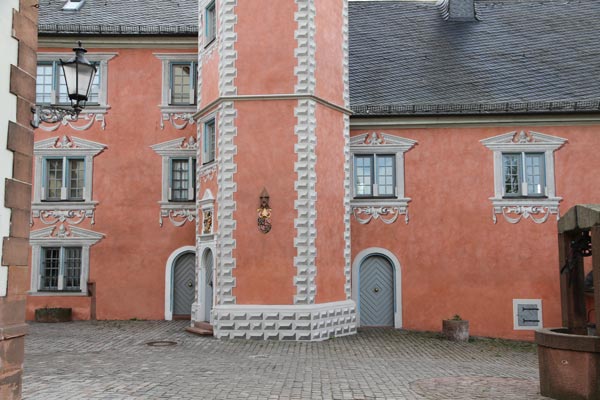 Rechts und links des Turmes liegen zwei rundbogige Erdgeschoßeingänge, in nächster Nähe zum Turmportal. Auffällig ist die illusionistische Bemalung des Schlosses nach manieristischer Art, nach alten Vorlagen 1975 restauriert. Man hatte 1964 Reste der alten Farbfassung aus der Zeit um 1620 entdeckt und sich daran orientiert. Facettierte Quadersteine, Pilaster, Gesimse, Sprenggiebel - alles ist illusionistische Malerei an der Schwelle von der Renaissance zum Barock. Solche Fassadendekorationen schufen mit den Mitteln der Malerei eine eigene Scheinwelt in den Wunschformen und galten zugleich als Form der Rezeption antiker Flächengestaltung, denn im "Goldenen Haus" des Nero in Rom gab es ähnliche Wanddekorationen aus der Römerzeit, und im Manierismus war das "der letzte Schrei".