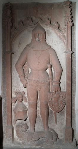 Interessant ist ferner die Unterscheidung zwischen dem vom Dargestellten getragenen Kopfschutz, der Beckenhaube, und dem heraldischen Helm mit der Helmzier daneben. Tatsächlich basiert die Beckenhaube in ihrer Entwicklung auf einem leichten Helm des 13. Jh., der unter dem Topf- oder später dem Kübelhelm zusammen mit einer Kopfpolsterung getragen wurde. Doch durch Befestigung des Kettengeflechtes, durch Verlängerung der festen Partien nach unten und durch Zuspitzung des Helmdaches entwickelte sich daraus die Beckenhaube als eigenständiger Typus, der ab dem 14. Jh. ohne Kübelhelm getragen wurde und dafür ein Nasal oder ein Klappvisier bekam und schließlich zur Hundsgugel wurde. Hier auf dem Epitaph hat die Beckenhaube bereits die zugespitzte Form, so daß sie eigentlich nicht mehr unter den Kübelhelm passen würde. Die Helmzier wird jedoch von dem bisherigen "Überziehhelm" getragen, der als heraldischer Helm erhalten blieb, auch wenn in der zukünftigen Praxis andere Helmmodelle als praktischer empfunden wurden.