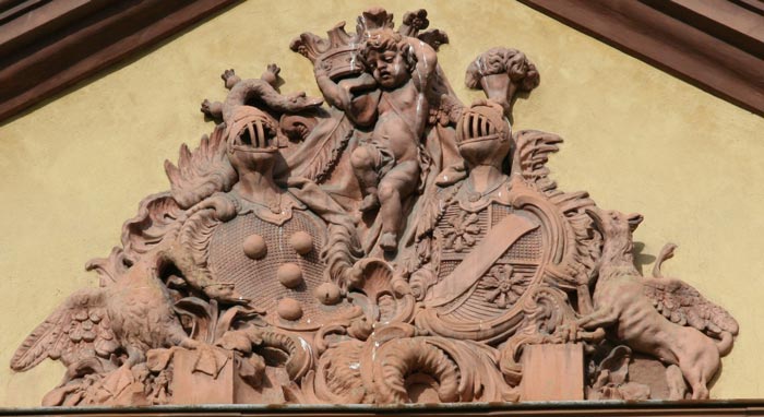 Das Allianzwappen im Giebelfeld der Gartenfassade bezieht sich auf Johann Ferdinand Sebastian Meinrad Freiherr v. Sickingen zu Hohenburg (21.1.1715-23.11.1772), Sohn von Ferdinand Hartmann Freiherr v. Sickingen zu Hohenburg (1673-29.8.1743) und Maria Elisabeth Margareta Sidonia Gräfin v. Pappenheim (17.9.1680-20.4.1734), und auf seine erste Frau Maria Anna Sophia von Greiffenclau-Vollraths (15.4.1722 - 1758), der Tochter von Johann Erwein Freiherr von Greiffenclau-Vollraths Burggraf zu Friedberg (1663-1727) und dessen Frau Maria Dorothea Freiin v. u. zu Franckenstein (ca. 1693-9.1.1756). Johann Ferdinand Sebastian Meinrad Freiherr v. Sickingen heiratete in zweiter Ehe Maria Anna Eleonore Sophia Theresia Antonia Walburga Eva Paulina Schenk v. Castell (-8.4.1778). Von seinen Nachkommen stammte aus erster Ehe Johann Nepomuk Kasimir Ferdinand Graf v. Sickingen zu Hohenburg (11.1.1745 -29.5.1795), k.k. Kämmerer und Burgmann zu Friedberg, und aus zweiter Ehe Johann Baptist Ferdinand Nepomuk Maria Adam Graf v. Sickingen zu Hohenburg (24.7.1769-15.10.1794).