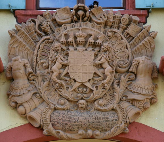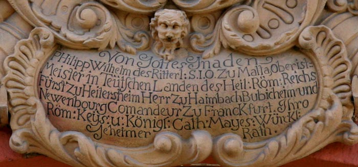 Auf der gartenseitigen Rückseite befindet sich ein Prunkwappen des fürstlichen Bauherrn, das inhaltlich identisch mit dem am alten Speicher beschriebenen Wappen ist. Die Inschrift lautet: "Von Gottes Gnaden PHilipp Wilhelm des Ritterl(ichen) S(ancti) I(ohannis) O(rdens) Zu Malta, Oberist=Meister in Teutschen Landen des Heil(igen) Röm(ischen) Reichs Fürst zu Heitersheim Herr zu Haimbach Bubicheim und Newenbourg Comandeur Zu FrancKfurt Ihro Röm(ischen) Keys(erlichen) u(nd) Königl(ichen) Cath(olischen) Mayes(tät) WürcKl(icher) Geheimer Rath."