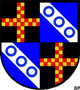 Feld 2 und 3: in Blau ein silberner Schrägbalken, belegt mit