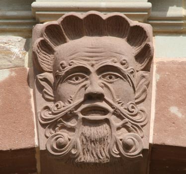 Deutlich sieht man den stilistischen Unterschied zwischen dem Barockbau mit dem über beide Stockwerke reichenden Prunkportal in der Mitte, vor dem eine beidseitige Freitreppe zu einem kleinen Podest führt, und mit den beiden je zweiachsigen Seitenrisaliten einerseits und den seitlichen Erweiterungsbauten, die im 19. Jh. überformt wurden, mit zwar gleichem Fensterrhythmus, aber gänzlich abweichender Dachgestaltung. Und dennoch bescheren uns die nach 100jähriger Baupause durchgeführten Umbauten ein zweites Prunkportal, im obigen Bild am rechten Bildrand zu sehen. Beide Prunkportale sind mit Allianzwappen verziert, die unten erläutert werden. Das frühere von beiden trägt die Inschrift "SALVS NOBIS DIEBVS NOSTRIS".