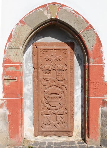 Barocke Grabplatte an der katholischen Pfarrkirche in Merl