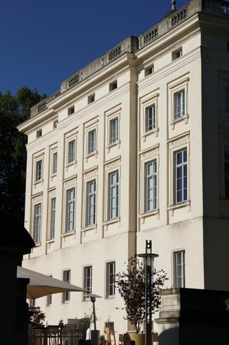 Unter der Loggia sind drei gleichgestaltete Eingänge, von Lagerfugenrustika umgeben. Ein weiterer architektonischer Trick ist, daß die Fenster der beiden Obergeschosse durch einen vertieften Rahmen eingefaßt werden und horizontale Gliederungselemente gleiche Abstände haben - tatsächlich sind die oberen Fenster schmäler und nur halb so hoch wie die des ersten Obergeschosses. Früher war die Raumnutzung wie folgt: Im Erdgeschoß lagen die Eingangshalle, ein Gartensaal und ein Gästeappartement. Das Treppenhaus liegt hinter den beiden rechten Fensterachsen im oberen Bild. Die Beletage enthält den Festsaal und Empfangszimmer, und die Loggia wird von hier aus betreten. Im in der obigen Abb. linken Teil lag das persönliche Appartement von Philipp Franz Wilderich Nepomuk Graf von Walderdorff mit Schlafzimmer und halbhohem Kabinett. Das dritte Geschoß enthielt Gästezimmer, und ganz oben unter dem Dach hatte die Dienerschaft ihren Platz.