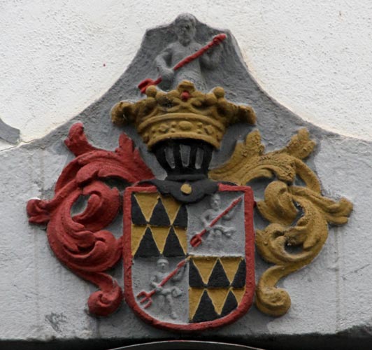 Über dem Hauseingang des Geroltshofes ist ein Vollwappen der Gerolt oder Gerolt zur Leyen (nach dem bei Linz gelegenen Familienbesitz zur Leyen) zu sehen. Das Wappen wird im Siebmacher Band: PrGfE Seite: 28 Tafel: 19 wie folgt beschrieben: Der Schild ist geviert, Feld 1 und 4: in Rot (hier jedoch Gold!) fünf (3:2) schwarze Spickel (oder genauer: rot-schwarz (hier gold-schwarz!) geteilt mit einer oben und unten anstoßenden Raute zwischen zwei ebensolchen, an Schild- und Feldrand angelegten halben Rauten, alles in verwechselten Farben), Feld 2 und 3: in Gold ein auf einem Felsen stehender wilder Mann, mit einer rot-schwarz geteilten Binde umgürtet, mit einer goldenen Kappe (Stulphut) mit drei Federn, einer roten zwischen zwei schwarzen, auf dem Kopf, in den Händen einen mit der dreizackigen Spitze nach rechts unten gekehrten Fischspeer haltend (hier farblich wenig differenziert). Auf dem gekrönten Helm mit lt. Siebmacher rechts schwarz-goldenen und links schwarz-roten Decken, hier einfach rot und golden gefaßt, der Mann mit dem dreizackigen Fischspeer wachsend. Hier wird die Krone so voluminös dargestellt, daß dahinter die Helmzier fast unscheinbar wirkt. Ein Wappenbrief für die Familie datiert von 1558. Das Wappen findet sich auch im Rietstap, auch dort mit rot-schwarzen Spickeln (entgegen der Farbregel!).