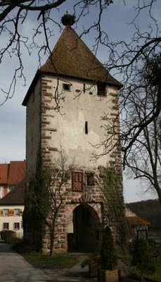 Einen zweiten Wappenstein aus dem 15. Jh. kann man am sog. Storchenturm finden. Das ist ein mittelalterlicher Torturm am Südende der Anlage, wie ein Stadttor gebaut mit spitzbogigem Tor und rechteckigem Falz als Anschlag für eine nicht mehr vorhandene Zugbrücke. Der Torturm wurde bereits während der allerersten Ausbauphase um 1260 errichtet, und damit ist er einer der ältesten Bauten des gesamten Areals. Die Spitze des pyramidenförmigen Walmdaches wird regelmäßig von einem Storchennest bekrönt. Die hofseitige Rückseite des Turmes enthält im oberen Bereich Fachwerk, und nur die oberen Stockwerke untereinander waren durch Stiegen verbunden; zum Erdgeschoß bestand keine dauerhafte Verbindung. Alternativ wird der Storchenturm auch Unterer Torturm, Rheinfelder Tor oder auch Gefängnisturm genannt.