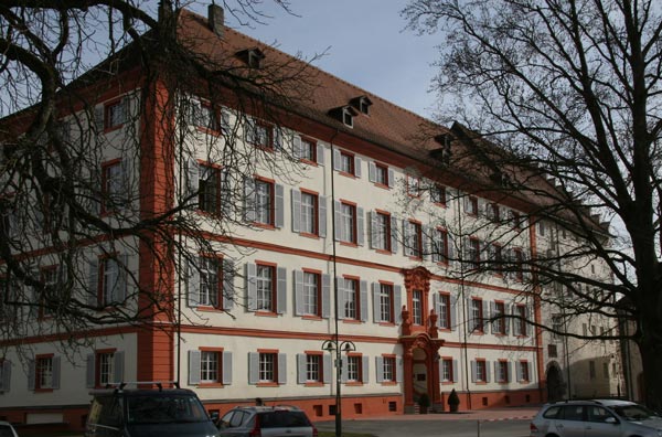 Abb.: Neues Schloß von Südwesten gesehen. Das heutige Aussehen erhielt der vom Ende des 16. Jh. stammende und unter Komtur Hans Hartmann von Hallwyl 1585-1598 errichtete Erweiterungsbau unter Komtur Graf Franz von Königsegg in den Jahren 1752-1757. Baumeister war Johann Caspar Bagnato, der den Renaissancecharakter des Gebäudes durch Abtrag der Treppentürme und Erker zerstörte und statt dessen dem Schloß durch entsprechende Dekorationen ein spätbarockes Gepräge gab. Das bisherige klösterliche Gepräge der Anlage verschwand, und Beuggen wurde zu einem spätbarocken, geistlichen Herrensitz.