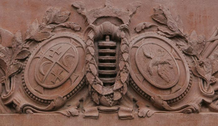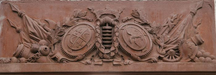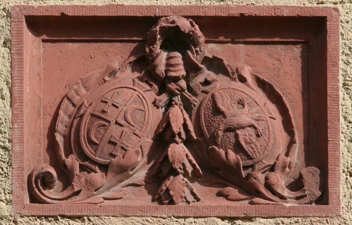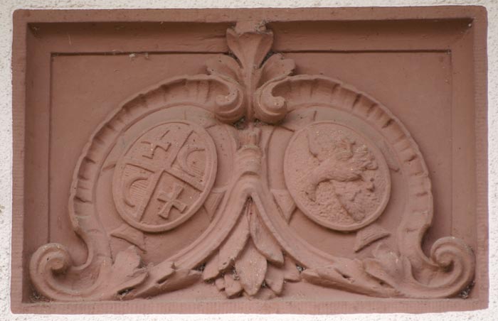 Stilistisch machen wir im Vergleich zu den bisher beschriebenen Wappensteinen einen deutlichen Sprung in den ganz späten Barock: In der Mitte ist oben ein aus Laub gewundener Kranz zu sehen, aus dessen Mitte nach unten ein weiteres, dreistufiges Laubgewinde herabhängt. Die Wappenschilde sind ovale Kartuschen, die schräg nach innen gelehnt sind, und deren Umrahmungen unten in einen außen seitlich eingerollten Zipfel auslaufen und oben wie Haken von hinten in den Lorbeerkranz eingehängt sind. Die farblich nicht gefaßten Wappen werden teilweise durch Schraffur hinsichtlich der Tingierung definiert.