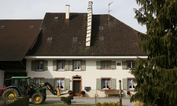Dieses Wappenpaar findet sich auf dem Gelände noch zweimal. Das zweite Exemplar findet man, wenn man im Süden des Schlosses jenseits der einstigen Befestigungsanlage nach Passieren des Storchenturmes in Richtung Rheinfelden nach ca. 50 m das Wohnhaus des etwas zurückgesetzt rechterhand liegenden Bauernhofes betrachtet. Dieser Hof hat eine ebensolange Geschichte wie das Hochschloß, denn er wurde bereits in der Schenkung 1246 erwähnt. Bis 1806 gehörte er als Versorgungsbetrieb zur Kommende, danach wurde er an Privateigentümer verkauft. Das zweistöckige Gebäude fällt vor allem durch den mitten aus dem Dach ragenden steinernen Stufengiebel auf. An der rechten, also nördlichen Gebäudehälfte ist der fragliche Wappenstein zwischen den Fenstern des Obergeschosses in die Außenwand eingelassen.