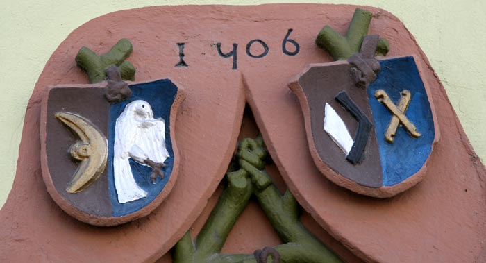 Abb.: Auf 1506 datiertes Wappenpaar an einem Haus in der Hauptstraße 59, heute Sitz der Fahrschule am Tor. Noch nicht zugeordnet, Hinweise willkommen.