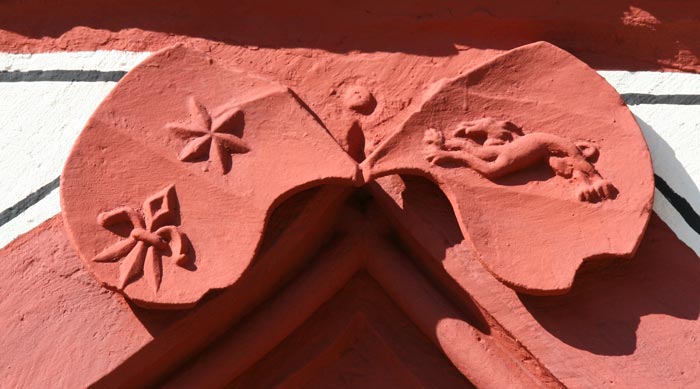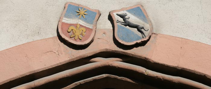 Abb.: Allianzwappen über einer spitzbogigen Tordurchfahrt in der Hauptstraße 36. Die Durchfahrt führt zum Adelshof. Gleiche Wappen wie oben, Stern aber achtzackig.
