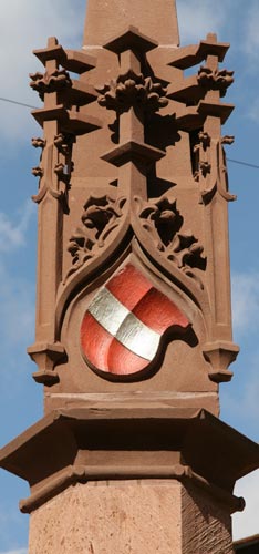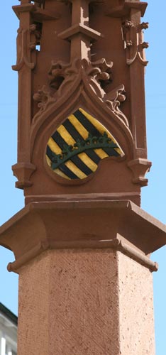 Österreich ist klar, und Üsenberg ebenfalls, beide ergeben zusammen auch das Stadtwappen - aber was hat hier Sachsen verloren? Schließlich waren die Habsburger die Landesherren, nicht die Sachsenherzöge. Aber, hier hilft die Genealogie weiter: Sigmund Erzherzog v. Österreich-Tirol (26.10.1427-1496), Sohn von Friedrich IV. Herzog v. Österreich-Tirol (-24.6.1439) und Anna v. Braunschweig-Göttingen (-1432), ist hier die Schlüsselfigur. Er wird auch der Münzreiche genannt. Seine erste Frau war Eleanor Prinzessin von Schottland (-20.11.1480), Tochter des schottischen Königs James I. (1394-1437). Mit ihr hatte er einen Sohn, Wolfgang v. Tirol, der aber am Tag seiner Geburt verschied. Nach dem Tod seiner schottischen Prinzessin, inzwischen hatte er 1478 die Landgrafschaft Breisgau als Lehen erhalten und war somit Landesherr geworden, vermählte er sich im Februar 1484 in Innsbruck zum zweiten Mal, diesmal mit Katharina v. Sachsen (24.7.1468-10.2.1524), Tochter von Albrecht Herzog v. Sachsen (31.7.1443-12.9.1500) und Sidonie v. Kunstadt-Podiebrad (1449-1.2.1510). Bei der Hochzeit war sie übrigens gerade mal 15 Jahre alt. Auf genau diese Ehe spielt das sächsische Wappen an, und somit läßt sich der Brunnen, also zumindest das zerstörte Original, auf den Zeitraum 1484-1490 datieren, weil Sigismund 1490 die Landesherrschaft an König Maximilian übergab.