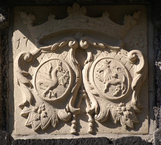 Heraldisch rechts ist das gewendete Stammwappen der von Breidbach zu Bürresheim zu sehen, in Silber ein zweibeiniger, geflügelter, roter, hier gekrönter Drache mit untergeschlagenem, pfeilspitzenendigen Schwanz, und gegenüber ist das Wappen der von Warsberg, in Schwarz ein silberner, golden gekrönter Löwe, golden (oder rot) bewehrt und gezungt. Die zugehörige, aber hier nicht dargestellte Helmzier wäre der Löwe sitzend oder wachsend zwischen einem schwarzen oder (silbern-schwarzen) Flug zu schwarz-silbernen Helmdecken. Das Wappen wird beschrieben im Gruber, bei Zobel auf Tafel 359 und im Siebmacher Band: Lot Seite: 43 Tafel: 29, Band: Bad Seite: 26 Tafel: 17, Band: Pr Seite: 69 Tafel: 90. Diese Wappenkombination paßt zu Ferdinand Damian von Breidbach-Bürresheim (1670-1747), auf Bürresheim, Breidbach und Nickenich, Obermarschall, kurtrierischer und kurkölnischer Geheimrat, vermählt mit Sophie Anna Helena von Warsberg (1678-1772, Tochter von Johann Philipp von Warsberg, oberster Erbburggraf zu Rheineck, und Maria Margareta von Metternich). Auch hier handelt es sich um eine Baumaßnahme, die von der Witwe 1758 durchgeführt wurde, denn ihr Mann war bereits 1747 verstorben. Sie war die Mutter des Mainzer Fürstbischofs Emmerich Joseph von Breidbach-Bürresheim (12.11.1707-11.6.1774).