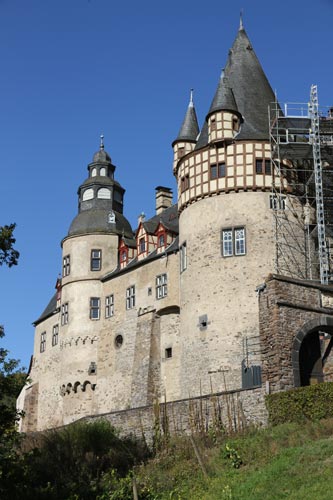 Der Unterbau des Südflügels (Abb. oben) zeigt jedoch seine ursprüngliche Funktion, denn hier sind zwei Flankentürme verbaut, die den hier südlich der Burg verlaufenden Zugangsweg schützten, der von der Hauptangriffsseite im Osten her kam. Nachdem man einen doppelten Halsgraben überwunden hatte, mußte man nach Passieren des äußeren Burgtores an diesen beiden Flankierungstürmen vorbei, ehe man nach einer 180-Grad-Wende den Zugang zum Zwinger erreichen konnte. Nach dem Zwinger gelangt man in den sog. Kanonenweg im Sockelgeschoß des darüberliegenden Amtshauses, der in den inneren Burghof führt. Der dickere Eckturm im Osten besitzt ein spätgotisches Fachwerkobergeschoß mit zwei kleinen, in Fachwerk gezimmerten Rundtürmchen auf dem Kegeldach; der schlankere Turm in der Mitte der Südseite kragt zweifach vor, erst über einem Rundbogenfries, dann über einem Blendmaßwerkfries. Er wird von einer barocken Haube aus der Zeit des Umbaus bekrönt.