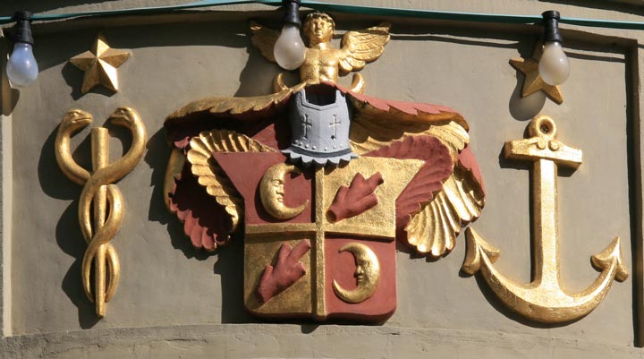 An der Brüstung der gerundeten Gebäudeecke steht das Wappen für den um 1858 verstorbenen Kaufmann Eberhard Friedrich Sandel. Es ist geviert, Feld 1 und 4: in Rot eine mit den Spitzen einwärts gerichtete, gesichtete Mondsichel, Feld 2 und 3: in Gold ein schräglinks gelegter und gestümmelter Baumstamm mit abgehauenen Ästen (Sandelholz, redendes Wappen). Auf dem Helm mit hier rechts golden-roten und links rot-goldenen Decken aus einer liegenden goldenen Mondsichel wachsend ein goldener, geflügelter Engelsrumpf.